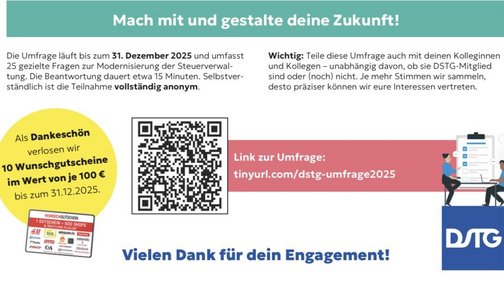 Wichtig: Teile diese Umfrage auch mit deinen Kolleginnen und Kollegen - unabhängig davon, ob sie DSTG-Mitglied sind oder (noch) nicht. Je mehr Stimmen wir sammeln, desto präziser können wir eure Interessen vertreten.